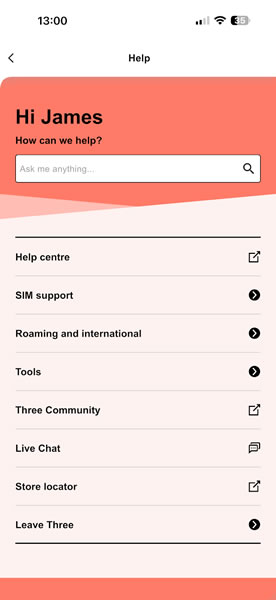 You can also change your price plan direct from the app once every bill cycle if you’re on a contract, plus the app can send you to support pages for all sorts of issues, from network coverage and problems, to delivery support and plenty more besides, and even has a live chat function if you want to talk to a Three employee.