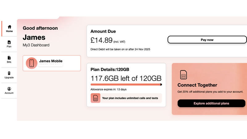 Your remaining allowances are front and centre on the main screen of your My3 account, so they’re easy to find, and you can view your bill right above that.