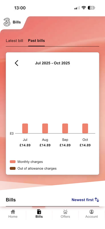 You can also update your personal details from My3, view or print your most recent bill or any others in the last twelve months, check any spends made outside your allowance, register a credit or debit card, set up a direct debit or pay your bill.