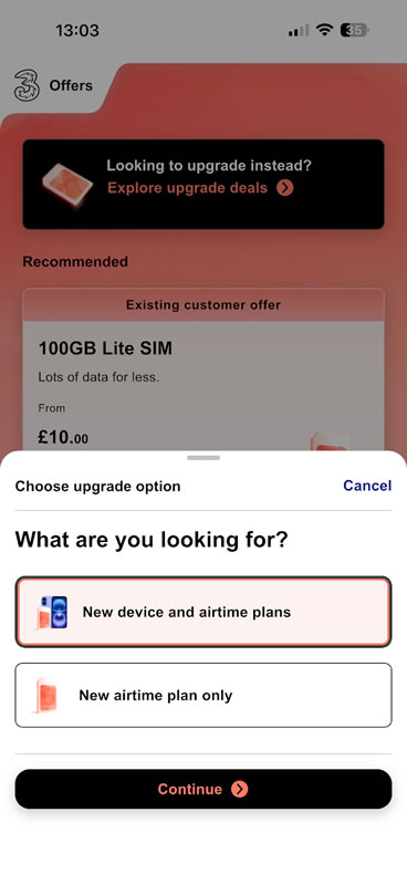 If you’re eligible to upgrade you can use the ‘upgrade’ option in the Three app. You can also upgrade by calling customer services on 333 from your Three phone, or 0333 338 1001 from any other phone.