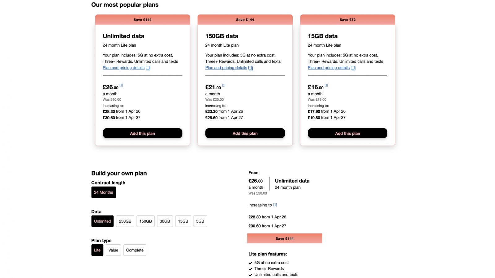 Lite plans are the cheapest, as they come with the fewest extras. You get a data allowance along with unlimited calls and texts, 5G, and access to the Three+ rewards app, which has discounts, freebies, and the like from other brands.